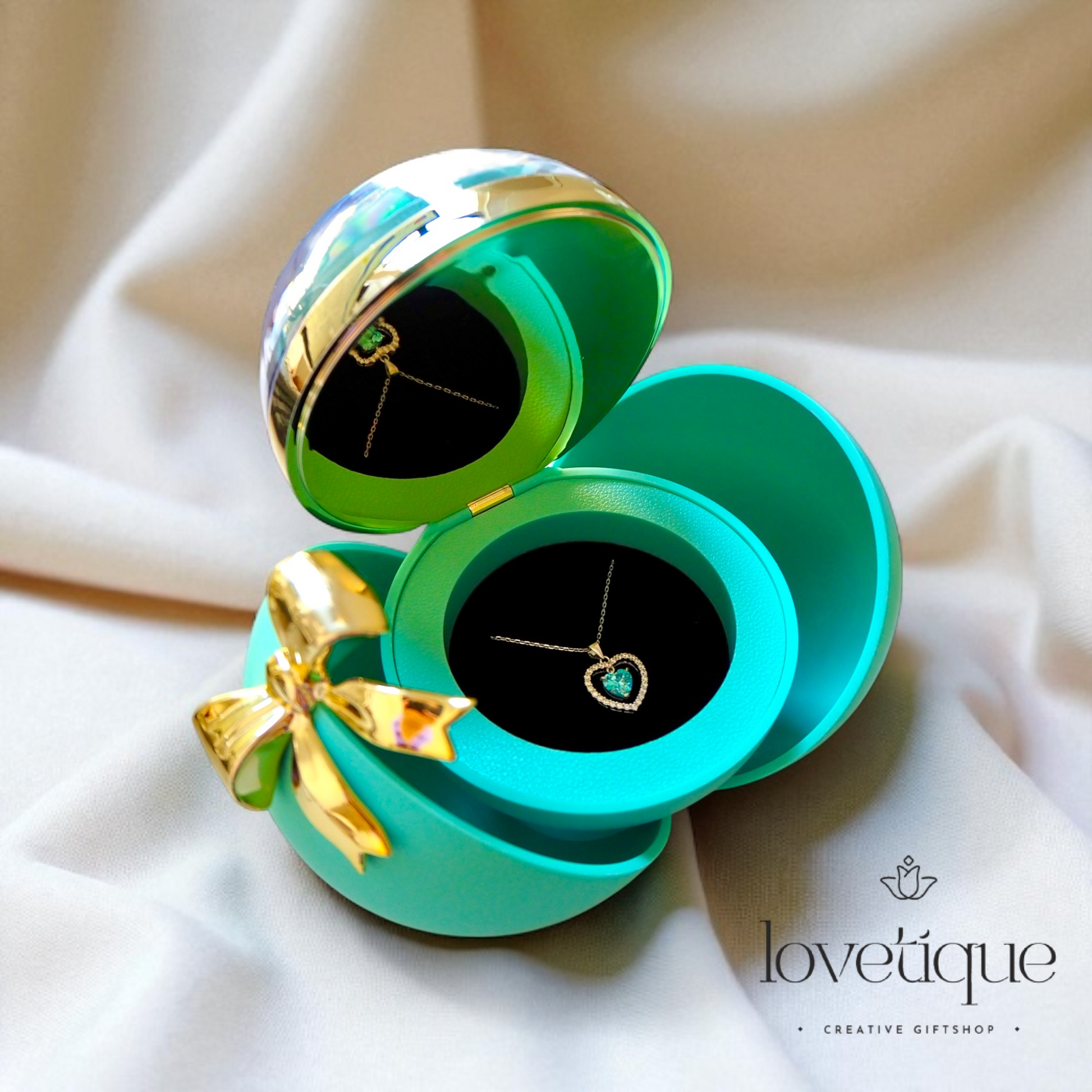 Featuring a heart-shaped blue crystal necklace nestled inside a Tiffany blue sphere jewelry box with a golden bow, this set is made to impress.